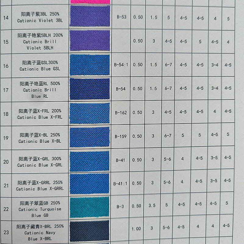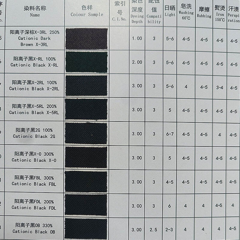 They have good wash fastness, making them suitable for daily clothing; however, their light fastness is moderate, so long-term exposure to sunlight should be avoided. With excellent solubility, they do not require additional dispersants during dyeing, and the dyeing process is simple. They can also be used for dyeing a small amount of acrylic blends and modified polyester fabrics.